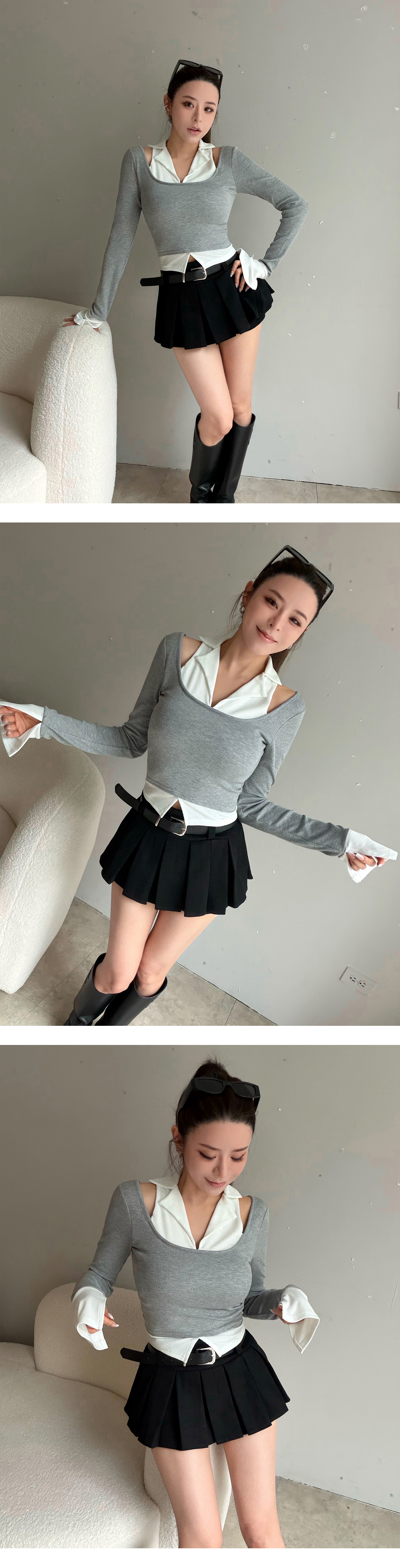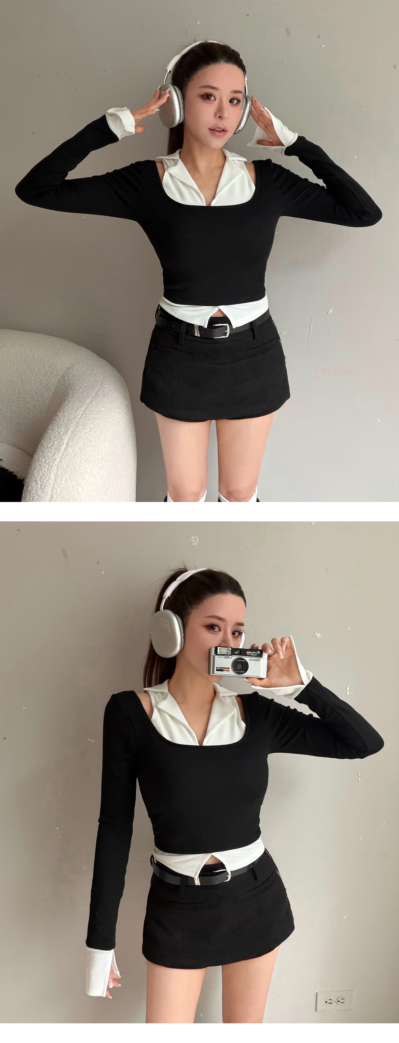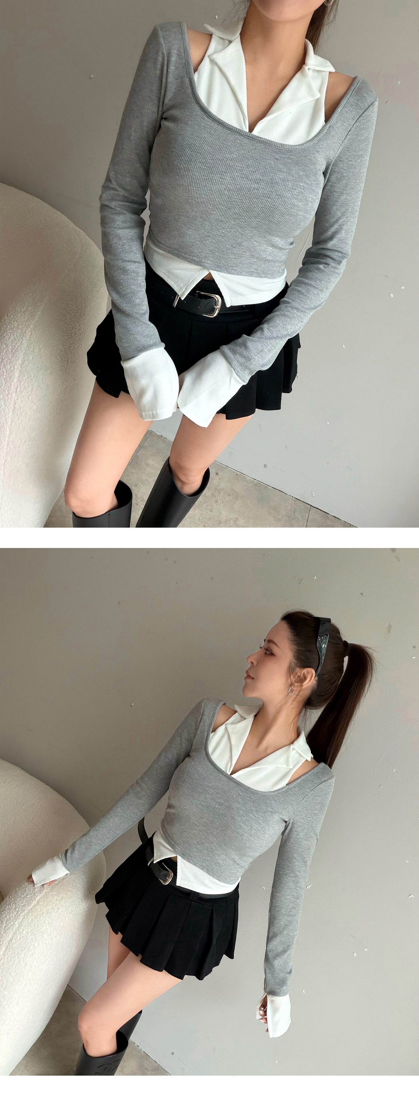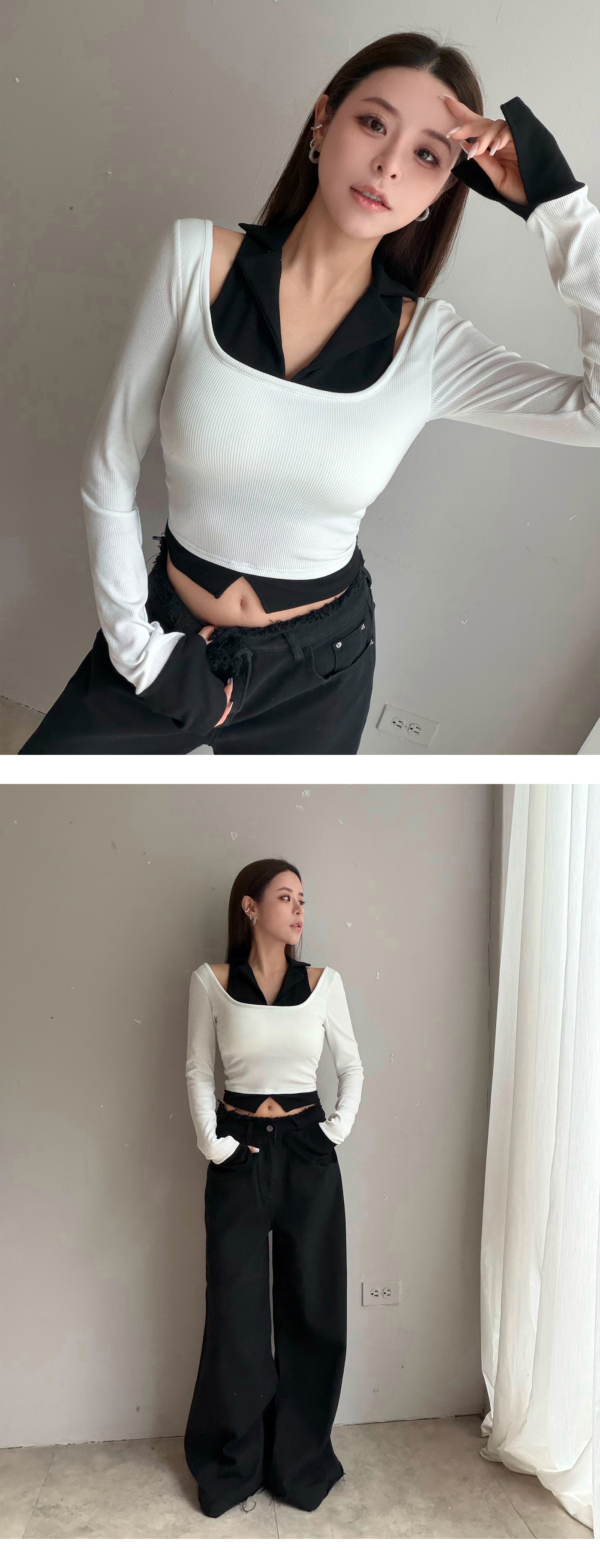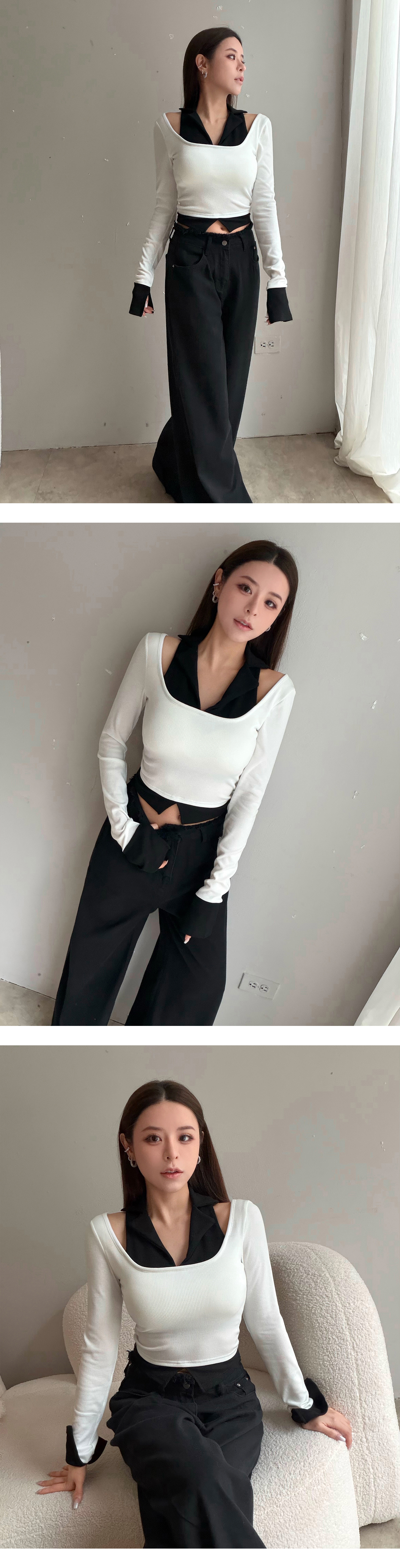 削肩假兩件附BRA拼色上衣
